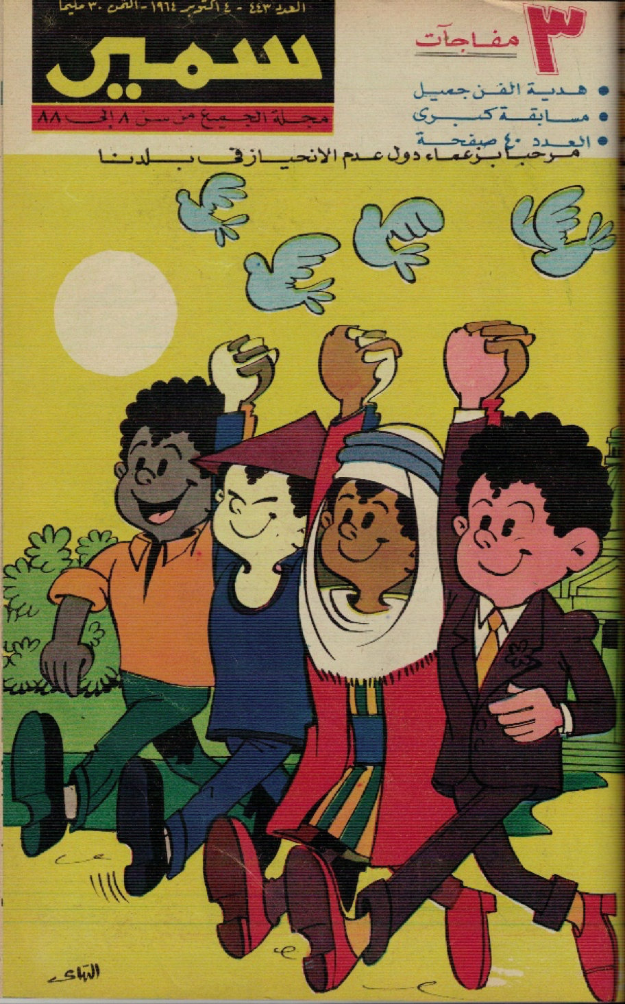 On the cover of this issue of the Egyptian children’s magazine “Samir”, in October 1964, are four versions of Samir, hands held in unison as they march into a future we can’t see. They champion peace (with the pigeons fluttering above them) on the occasion of the second Non-alliance summit in Cairo. The versions of Samir could represent children from the three continents, Latin America, North and Subsaharan Africa and Asia. Alternatively, one may imagine Abdelnasser, Ben Bella, Sukarno, and Nkrumah…or their children. It is clearly left to the reader’s imagination, in a time where the future was being reconstrued and imagined along new political fault-lines based on anti-imperial movements and new alliances.