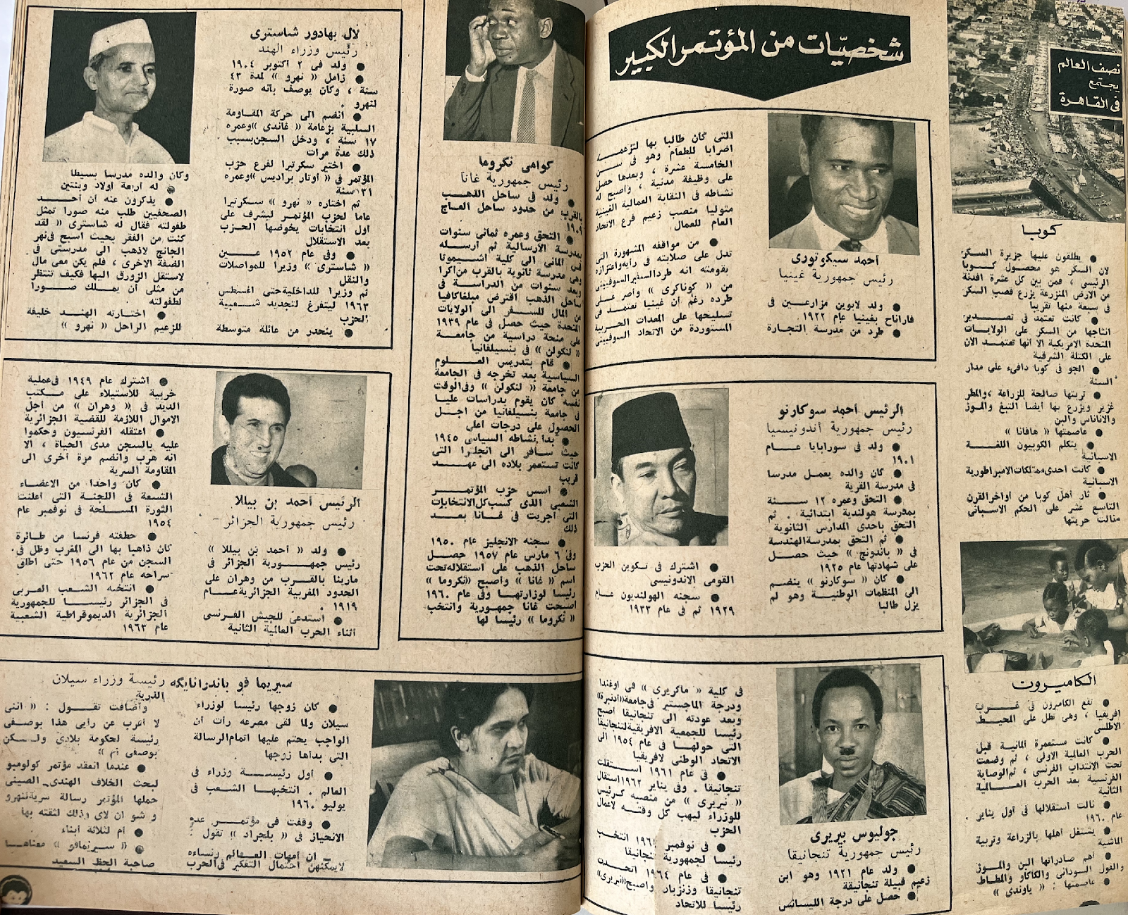 The text starts with a quote by Abdelnasser, “The picture of this conference is, I believe, the closest to a picture of a peace assembly. Therefore, it is important in my opinion that peace – peace that is based upon justice – becomes the biggest goal of this conference…”. The rest of the article quotes Abdelnasser, on the meaning of “non-alignment”: establishing policies based on our own priorities and not those of the more powerful nations whose alliance or support we may need. The article lists the 59 countries (“half of the world in Cairo!”) while indicating how many more there are than the 24 nations that gathered for the first non-alliance conference in Belgrade in 1961. It indicates the main issues covered by the conference, namely studying the international political scene in general, colonialism and countries still struggling for their independence, racial segregation, and stopping nuclear trials. The conference’s resolutions, including letters to Kennedy and Khrushev calling for this nuanced understanding of peace, and indicating the conditions for non-alliance.