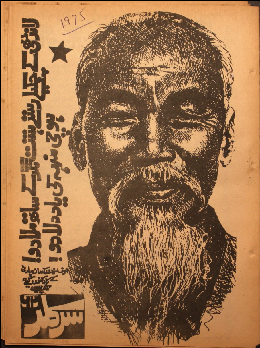 a 1975 cover of the Mazdoor Kissan Party Circular, the organ of the MKP. Alongside Ho Chi Minh’s photo, an inscription reads: “oin together the shining paths of Hashtnagar and Landhi. Bring back the memory of Ho Chi Minh!”Source: Noaman Ali