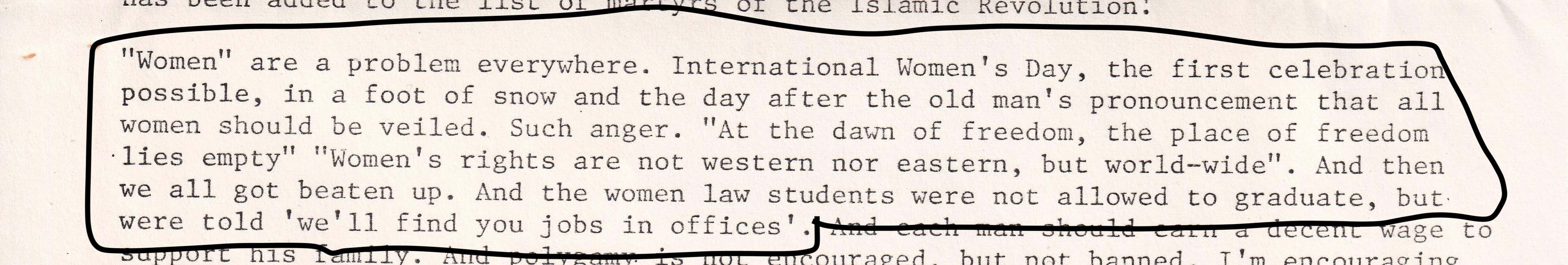 I do not suspect that my mother would describe these materials as an archive. They were simply her life. Although I am not certain, I assume the letters—addressed to her mother, grandmother, aunt and brother back home in the UK—came back into her possession after the death of her mother in 2006. Now they move from mother to daughter again, in death. These materials take on a new significance, a new weight and a new terminology. I describe the collection as an archive, an archive that narrates a significant period in my family history alongside a momentous period in the history of Iran. The contents are at once personal and political, intimate and social. Traversing these multiple states, they offer an inclusive way to think about the family archive, not just as personal and singular but simultaneously deeply enmeshed in its historical moment via the materials and their properties and the stories that the items hold.1 In this case, the collection holds both the “small” history of a period of time in my family narrative (indeed of a family I was not yet part of) and a “big” history of Iran’s revolution.2 This collection is both a route to narrate, organise and process significant moments in my family history and it is much more than that. It is an archive that contributes to understandings of women’s experiences of the revolution, that complicates and adds to the cacophony of writings about the era, and that integrates the hope and potency of the ideological struggles at the heart of the revolution. My mother’s point of view is also particular and distinct; she is a young, British Jewish woman, an intellectual, a leftist, and a feminist.